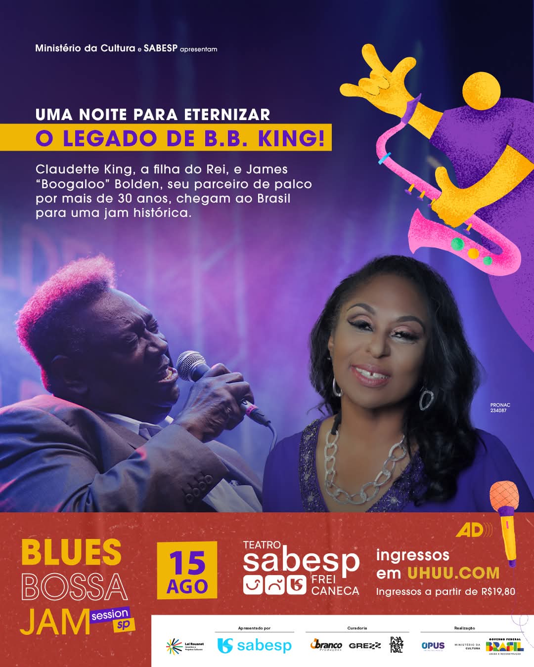 O Teatro Sabesp Frei Caneca recebe nesta sexta-feira, 15 de agosto, a abertura do projeto Blues Bossa Jam Session com o show “100 Anos B.B. King – Claudette King & James ‘Boogaloo’ Bolden”. Filha do eterno Rei do Blues, B.B. King, Claudette King é reconhecida por sua potente interpretação e carisma, carregando o legado do pai com uma identidade própria que mistura blues, soul e influências contemporâneas.
