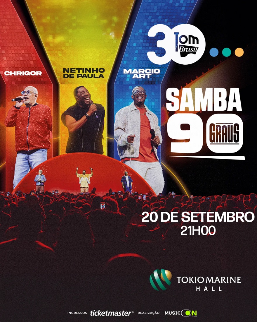 Chrigor (Exaltasamba), Netinho (Negritude Jr.) e Márcio Art (Art Popular) se reúnem no palco do Tokio Marine Hall para celebrar a era de ouro do pagode dos anos 90. O espetáculo “Samba 90 Graus” que acontece no dia 20 de setembro, em São Paulo, que reúne esses três grandes ícones do samba nacional vai embarcar o público de São Paulo em uma viagem nostálgica e repleta de emoção, revivendo os maiores sucessos que marcaram gerações e fizeram história no cenário do samba e pagode brasileiro.