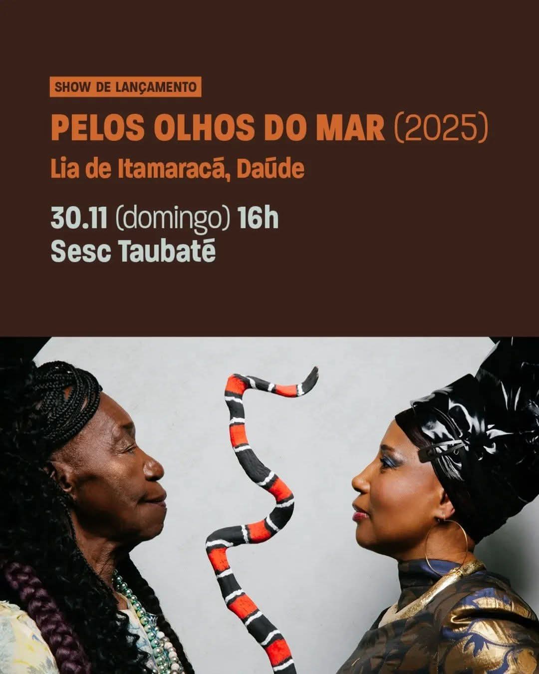 Encantador, potente e mágico: a tríade de palavras pode bem definir o mar. Aqui elas descrevem também “Pelos olhos do mar, novo lançamento do Selo Sesc que traz a primeira parceria fonográfica entre Daúde e Lia de Itamaracá. O álbum marca um encontro que une força ancestral e modernidade traduzidas nas vozes pujantes de duas mulheres representantes da cultura popular. O lançamento acontece em 27/11 nas principais plataformas de áudio e em formato físico, além dos shows de lançamento e audição com bate-papo.