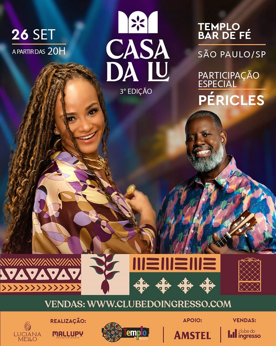 A música brasileira vai ganhar um encontro histórico no dia 26 de setembro, quando Luciana Mello apresenta a 3ª edição do projeto autoral “Casa da Lu”, no palco do Templo Bar de Fé, em São Paulo. Nesta noite, a cantora recebe o convidado especial Péricles, um dos maiores intérpretes da nossa música, para uma celebração emocionante do samba e do pagode.