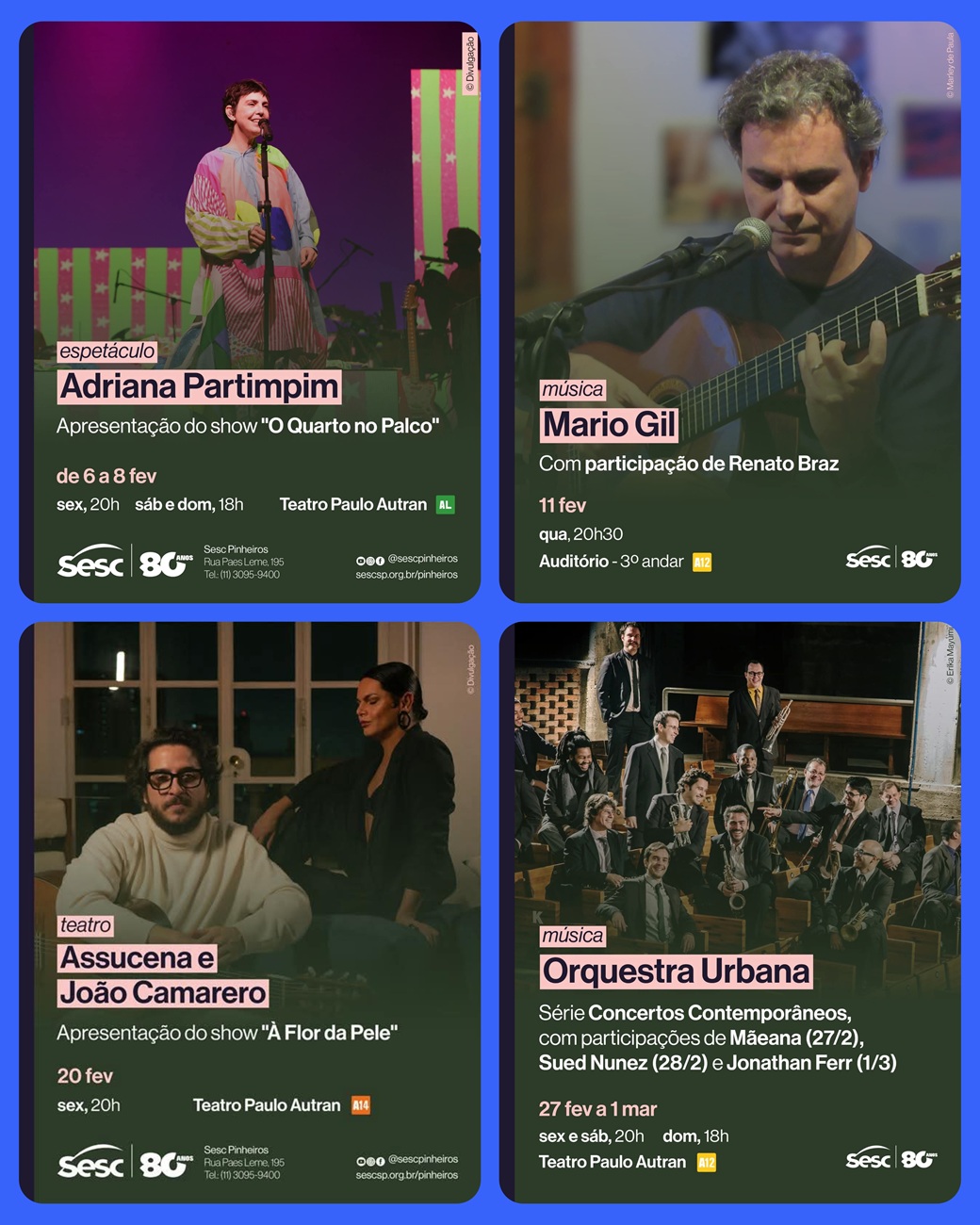Em fevereiro, para além do Carnaval o Sesc Pinheiros tem um leque de apresentações musicais para diferentes idades e estilos.