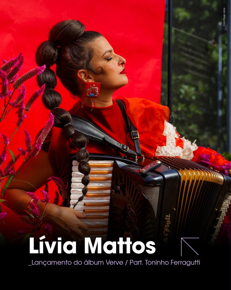 26, sexta-feira, acordeonista e cantora-compositora baiana Lívia Mattos apresenta no teatro do Sesc Santana o show de lançamento do álbum Verve. O trabalho completa a trilogia fonográfica iniciada com Vinha da Ida (2017) e Apneia (2022), dando continuidade à pesquisa da artista em torno de sonoridades do acordeom.