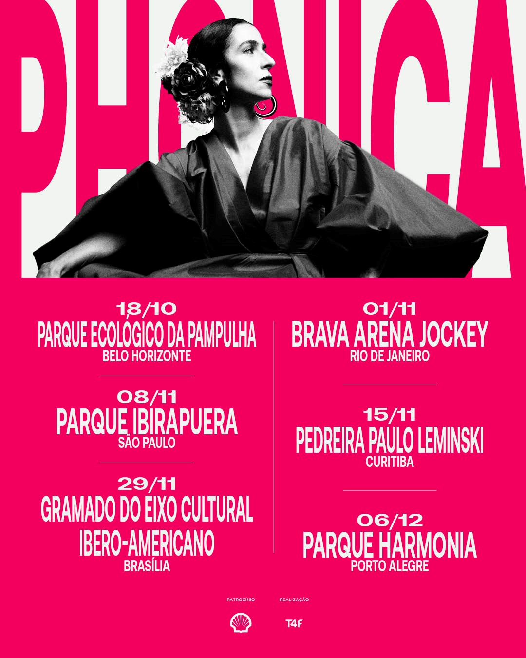 A turnê Phonica – Marisa Monte & Orquestra Ao Vivo faz seis apresentações em todo o Brasil com estreia em Belo Horizonte e passando por Rio de Janeiro, São Paulo, Curitiba, Brasília e Porto Alegre. Confira abaixo as datas e locais das apresentações: