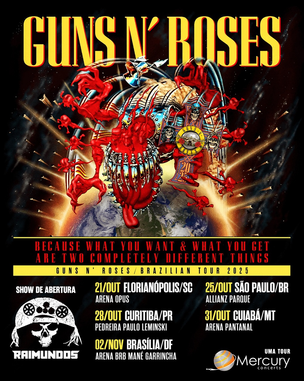 Em outubro, o Guns N’ Roses chega ao Brasil com a turnê “Because What You Want and What You Get Are Two Completely Different Things”, e a banda Raimundos será a atração de abertura nas cinco datas: dia 21 de outubro em Florianópolis (Área Externa da Arena Opus), dia 25 de outubro em São Paulo (Allianz Parque), dia 28 de outubro em Curitiba (Pedreira Paulo Leminski), dia 31 de outubro em Cuiabá (Arena Pantanal) e dia 2 de novembro, em Brasília (Arena BRB).