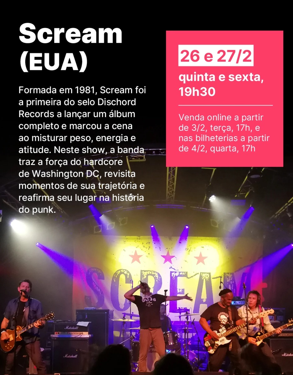 A banda norte-americana Scream, referência da cena hardcore punk de Washington, D.C., se apresenta nos dias 26 e 27 de fevereiro de 2026, no Sesc Avenida Paulista, com shows que percorrem diferentes fases de sua trajetória. Atualmente, o grupo é formado por Pete Stahl (vocal), Franz Stahl (guitarra e backing vocal), Skeeter Thompson (baixo e backing vocal), Clint Walsh (guitarra e backing vocal) e Jerry Busher (bateria).