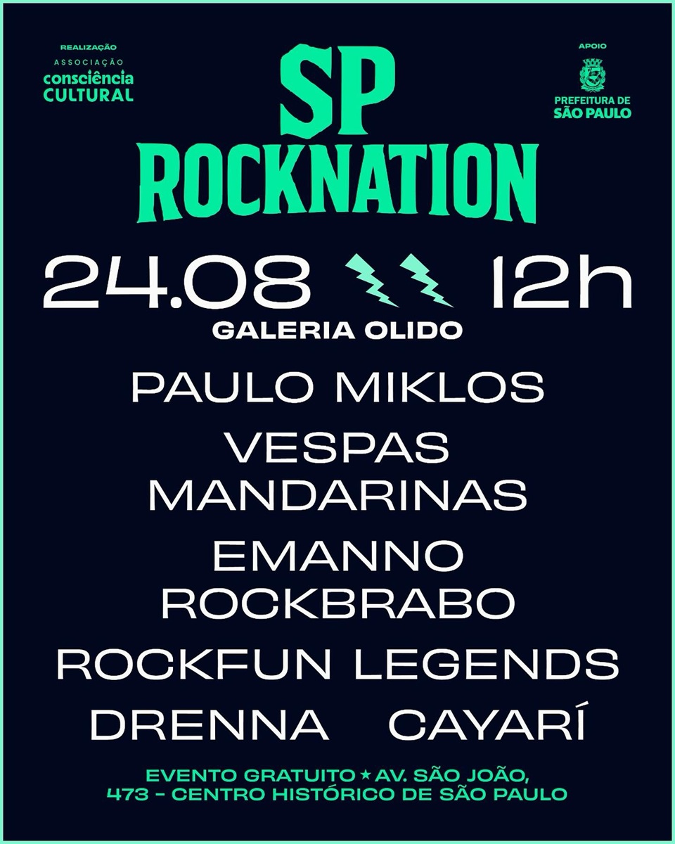 SP RockNation é um festival recorrente e gratuito de São Paulo que traz nomes do rock autoral brasileiro para grandes palcos. Nesta edição, que acontece domingo (24), tocam Paulo Miklos, Vespas Mandarinas, Cayarí, Drenna, Emano Rockbrabo e Rockfun Legends com a convidada Cyz da banda Plutão Já Foi um Planeta. A entrada começa a partir do meio-dia no Centro Cultural Olido, ao lado da Galeria do Rock.
