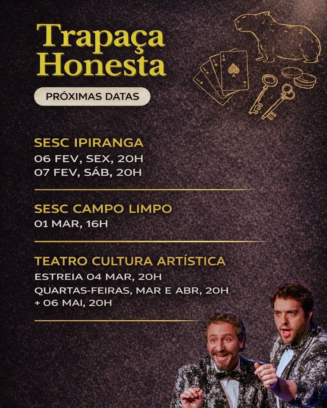 A premiada Cia Fundo Falso dá sequência à circulação de Trapaça Honesta, espetáculo de mágica que teve temporada com sessões esgotadas e que propõe uma investigação cênica sobre os mecanismos por trás de golpes e ilusões do cotidiano. As apresentações estão marcadas para os dias 6 e 7 de fevereiro, sexta e sábado, às 20h, no Sesc Ipiranga. Em seguida, o grupo se apresenta no Sesc Campo Limpo no dia 1º de março, domingo, às 16h. A partir do dia 4 de março, o espetáculo entra em cartaz no Cultura Artística com sessões semanais às quartas-feiras, 20h, até o dia 6 de maio.